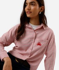 camisa oversized feminina com algodão bolso bordado listrada vermelha