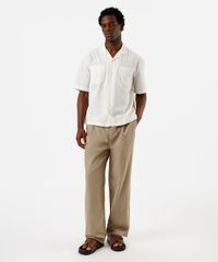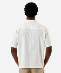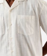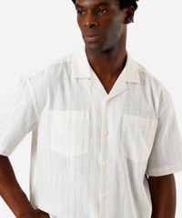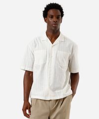 Camisa masculina confeccionada em algodão. Possui modelagem relaxed proporcionando maior conforto, caimento solto, gola esporte, mangas curtas, bolsos frontais, estampas com padronagens listradas e fechamento frontal com botão. Acabamento pespontado.