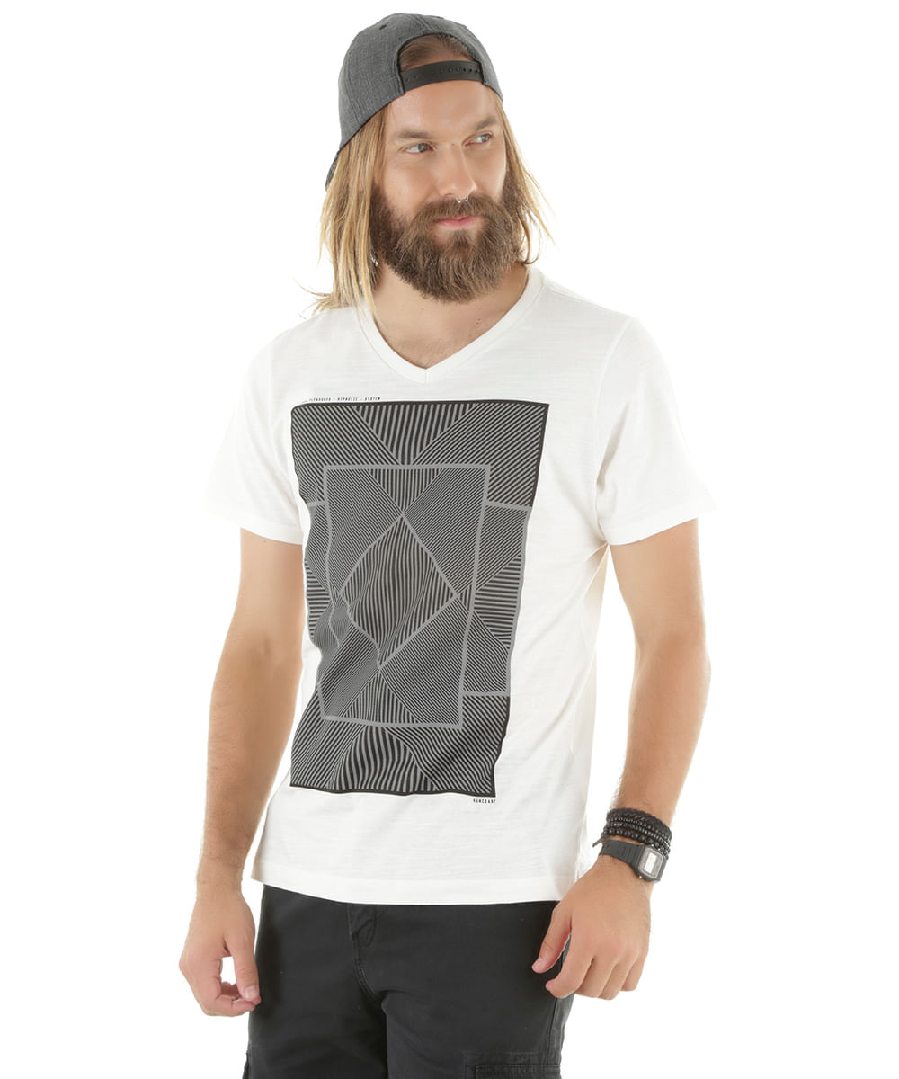 Essa camiseta foi confeccionada em malha flamê de toque macio. O modelo se destaca pela estampa frontal geométrica com a frase "Retinal pleasures". O decote é V com acabamento canelado enquanto as mangas são curtas.