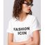 Camiseta baby tee feminina confeccionada em malha macia de algodão com estampa localizada escrito "Fashion icon" na parte frontal. A peça tem a modelagem reta e o caimento é confortavelmente solto ao corpo. O modelo tem gola redonda e as mangas são curtas com acabamento pespontado nos punhos e na barra.