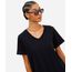 Camiseta feminina confeccionada em malha encorpada de algodão. A peça tem a modelagem reta e o caimento é confortavelmente solto ao corpo. O modelo tem decote v em tecido com textura canelada e as mangas são curtas com acabamento pespontado nos punhos e na barra.