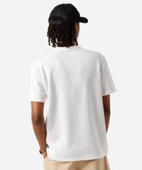Camiseta masculina confeccionada em malha texturizada com algodão. A peça tem a modelagem reta e o caimento é confortavelmente solto ao corpo. O modelo tem gola redonda em tecido com textura canelada e as mangas são curtas com acabamento pespontado nos punhos e na barra.