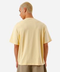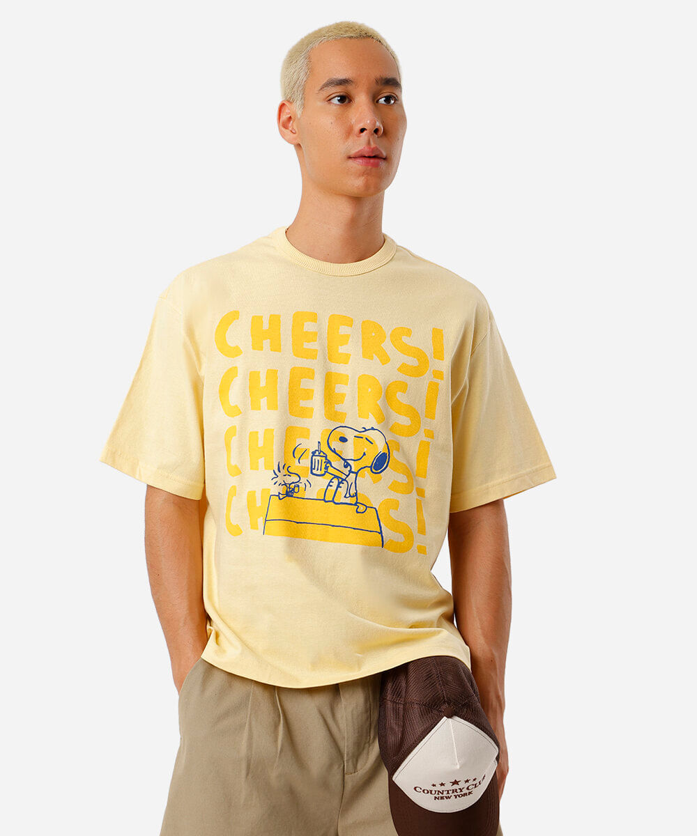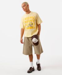 Camiseta masculina confeccionada em malha macia de algodão com estampa localizada do Snoopy na parte frontal. A peça tem a modelagem box fit, com construção reta e o caimento é confortavelmente solto ao corpo. O modelo tem gola redonda em tecido com textura canelada e as mangas são curtas com acabamento pespontado nos punhos e na barra.