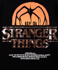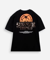 Camiseta juvenil confeccionada em algodão. Possui modelagem reta, caimento comfort, gola redonda com toque canelado, mangas curtas, estampa frontal e posterior temática da série Stranger Things metalizada, e acabamento pespontado.