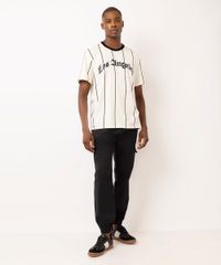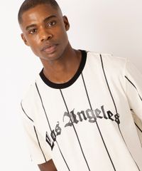 • Design com padronagem listrada e estampa frontal "Los Angeles" em estilo gótico.