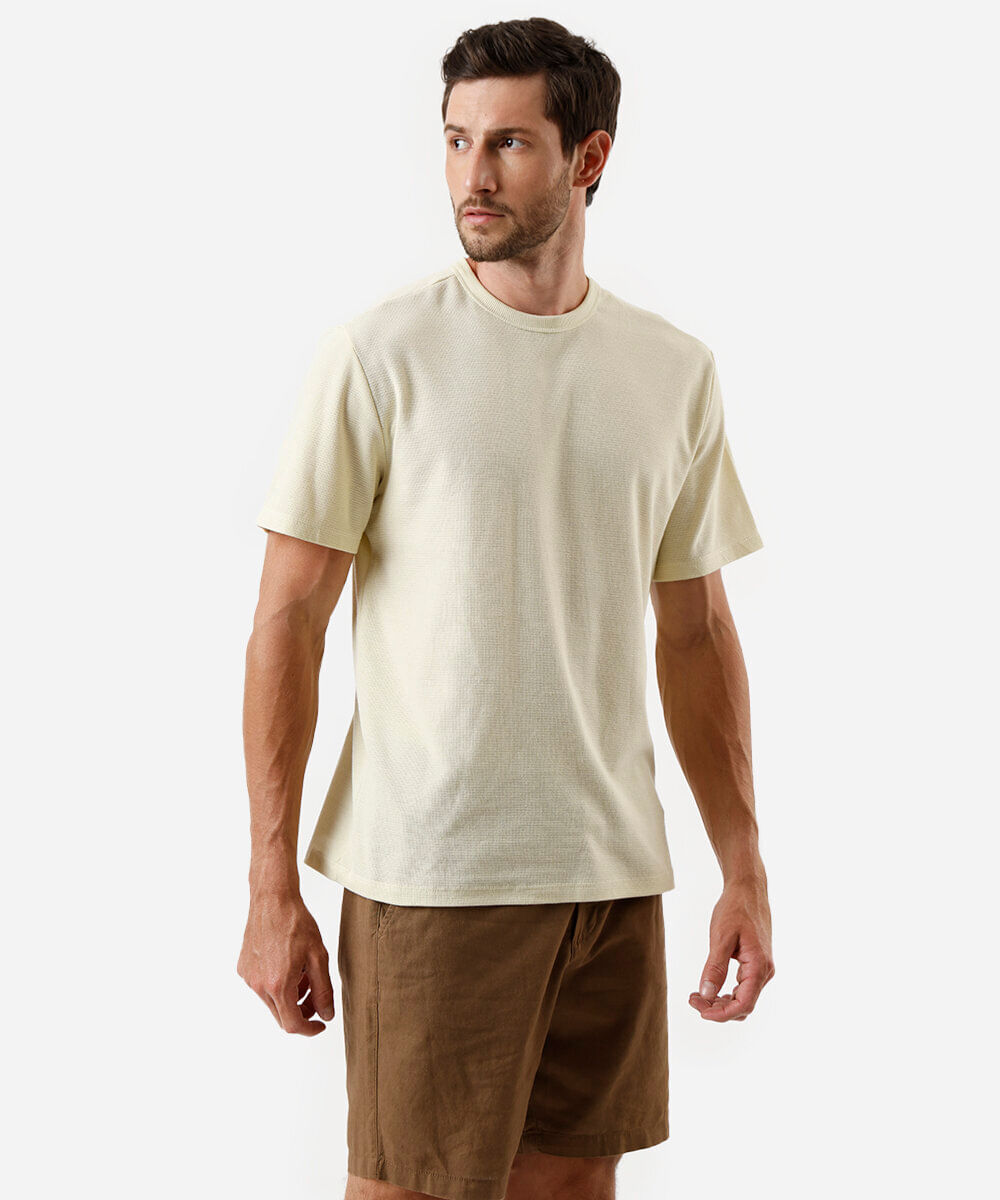 Camiseta masculina confeccionada em malha com algodão e toque levemente macio. Possui modelagem reta, caimento comfort, gola redonda com toque canelado, mangas curtas e acabamento pespontado.
