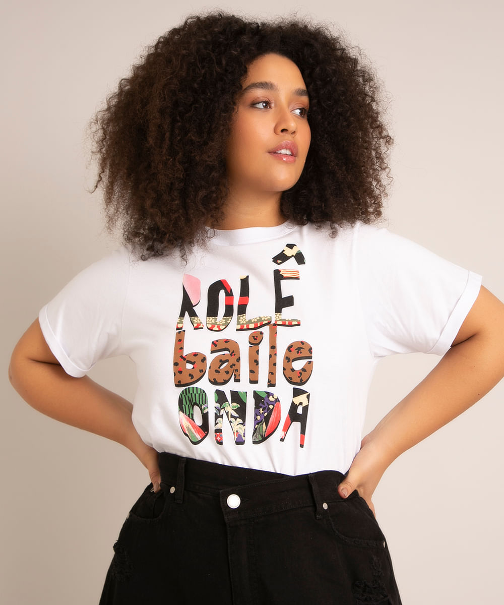 Camiseta cropped feminina desenvolvida em malha macia de algodão com estampa localizada escrito "rolê, baile, onda". A peça tem modelagem reta, com caimento super confortável e soltinho ao corpo. O modelo tem decote redondo com aplicação de ribana e mangas curtas com acabamento dobrado nos punhos.