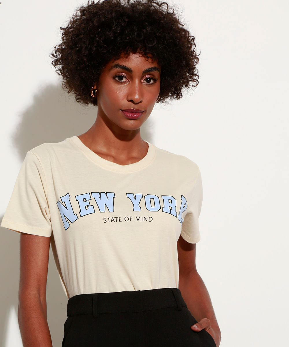 Camiseta feminina confeccionada em malha. O modelo tem caimento reto, manga curta e decote redondo em ribana. Possui estampa frontal com a frase "New York state of mind".