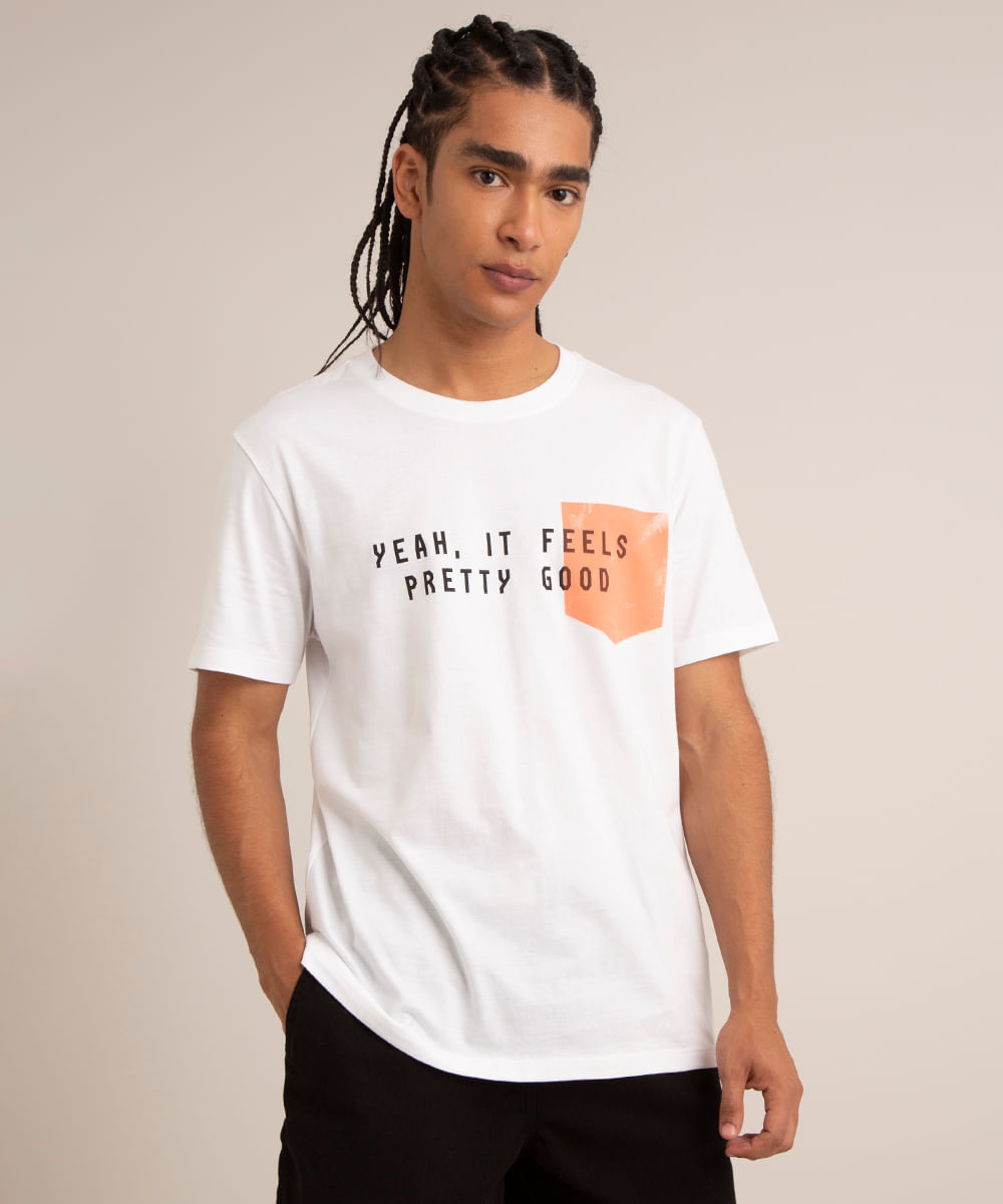 • Estampa frontal com lettering e um bolso falso estampado, adicionando um toque criativo ao visual.