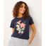 Camiseta feminina confeccionada em malha de algodão com toque macio. A peça possui modelagem e caimento reto, decote redondo canelado, mangas curtas, estampa frontal com desenho de flor e escrita "choose to bloom" em cores contrastantes, acabamento pespontado.