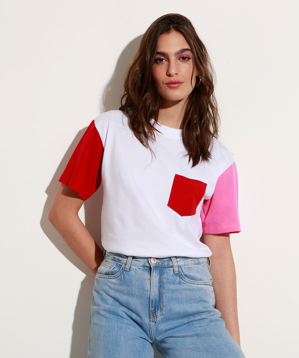 Camiseta feminina desenvolvida em malha de algodão. A modelagem é ampla com caimento solto. Possui aplicação de um bolso frontal. As mangas são curtas em cores contrastantes, em referência à tendência bicolor, e o decote é redondo.