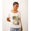 Camiseta feminina confeccionada em malha macia de algodão com estampa localizada de folhagens com efeito metalizado na parte frontal. A peça tem a modelagem reta e o caimento é confortavelmente solto ao corpo. O modelo tem gola redonda em tecido com textura canelada e as mangas são curtas com acabamento simples nos punhos e na barra.
