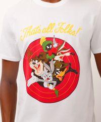Camiseta confeccionada em malha de algodão macia. Modelo com caimento reto e estampa com tema do Looney Tunes, gola redonda, mangas curtas e barra pespontada.