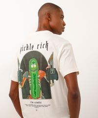 Camiseta confeccionada em malha de algodão com toque macio. A peça possui modelagem reta com caimento solto, decote redondo canelado, mangas curtas, estampa frontal com escrita "rick and morty" e posterior com desenho de personagem com relevo e acabamento pespontado.