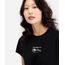 Camiseta confeccionada em malha. Possui gola redonda canelada e manga curta. Possui estampa frontal de escrita divertida e gata e barra pespontada.