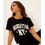 Camiseta feminina confeccionada em malha de algodão com estampa localizada escrito " Manhattan" na parte frontal. A peça tem modelagem levemente solta ao corpo com recorte na barra fazer amarração. O modelo tem gola careca e mangas curtas.