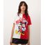 Camiseta confeccionada em malha macia de algodão. Modelo bi color com caimento reto, estampa da Minnie e do Mickey, gola redonda, mangas curtas e barra pespontada.