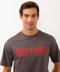 Camiseta masculina confeccionada em malha de algodão com toque macio. A peça possui modelagem relaxed com caimento solto, decote redondo canelado, mangas curtas, estampa frontal e posterior da banda Guns n' Roses com escrita e desenho, acabamento pespontado.
