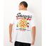 Camiseta confeccionada em malha de algodão com toque macio. A peça possui modelagem reta com caimento solto, decote redondo canelado, mangas curtas, estampa com relevo frontal e posterior com desenho do personagem Snoopy e escrita "Snoop's slice shop delivery pizza" e acabamento pespontado.