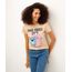 Camiseta feminina confeccionada em malha macia de algodão com estampa localizada de personagens do filme Lilo & Stitch na parte frontal. A peça tem a modelagem reta e o caimento é confortavelmente solto ao corpo. O modelo tem gola redonda em tecido com textura canelada e as mangas são curtas com acabamento simples nos punhos e na barra.