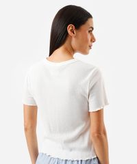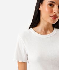 Camiseta de pijama avulsa ideal para diversas combinações. A peça é confeccionada em malha de algodão e textura canelada. O modelo possui decote redondo, mangas curtas e acabamento que formam delicados frufru na manga e na barra da peça.