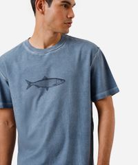 • Design dupla face: um lado com estampa localizada de sardinha e o outro com a frase "Livre como o mar".