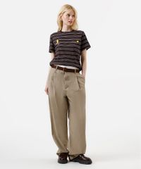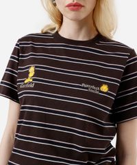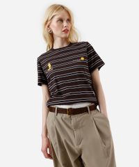 Camiseta feminina confeccionada em malha macia de com algodão estampa listrada e localizada do Garfield na parte frontal. A peça tem a modelagem reta e o caimento é confortavelmente solto ao corpo. O modelo tem gola redonda em tecido com textura canelada e as mangas são curtas com acabamento pespontado nos punhos e na barra.
