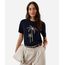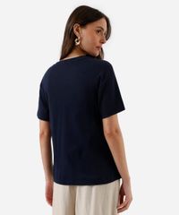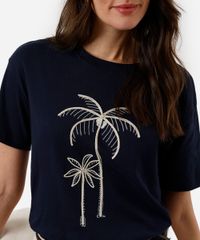Camiseta feminina confeccionada em malha macia de algodão com bordado localizado de coqueiros com lurex na parte frontal. A peça tem a modelagem reta e o caimento é confortavelmente solto ao corpo. O modelo tem gola redonda em tecido com textura canelada e as mangas são curtas com acabamento pespontado nos punhos e na barra.