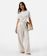 Camiseta feminina confeccionada em malha macia de algodão com bordado localizado de estrela-do-mar e concha na parte frontal. A peça tem a modelagem reta e o caimento é confortavelmente solto ao corpo. O modelo tem gola redonda em tecido com textura canelada e as mangas são curtas com acabamento pespontado nos punhos e na barra.