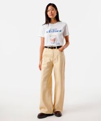 Camiseta feminina confeccionada em malha macia de algodão com estampa localizada de ilustração de copo de latte e a frase "taste at it's finest" na parte frontal. A peça tem a modelagem reta e o caimento é confortavelmente solto ao corpo. O modelo tem gola redonda em tecido com textura canelada e as mangas são curtas com acabamento pespontado nos punhos e na barra.