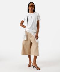 Camiseta feminina confeccionada em malha macia de algodão com estampa localizada de ilustração de cachorro dentro de um drink. A peça tem a modelagem reta e o caimento é confortavelmente solto ao corpo. O modelo tem gola redonda em tecido com textura canelada e as mangas são curtas com acabamento pespontado nos punhos e na barra.
