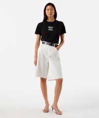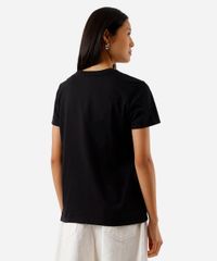 Camiseta feminina confeccionada em malha macia de algodão com estampa localizada de ilustração de gatinho e coração e a frase "culpado Mercúrio retrógrado" na parte frontal. A peça tem a modelagem reta e o caimento é confortavelmente solto ao corpo. O modelo tem gola redonda em tecido com textura canelada e as mangas são curtas com acabamento pespontado nos punhos e na barra.
