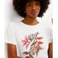 Camiseta feminina confeccionada em malha macia de algodão com estampa floral localizada na parte frontal. A peça tem a modelagem reta e o caimento é confortavelmente solto ao corpo. O modelo tem gola redonda em tecido com textura canelada e as mangas são curtas com acabamento pespontado nos punhos e na barra.
