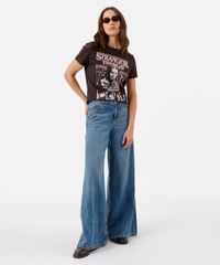 Camiseta feminina confeccionada em malha macia de algodão com estampa localizada temática da série Stranger Things na parte frontal. A peça tem a modelagem reta e o caimento é confortavelmente solto ao corpo. O modelo tem gola redonda em tecido com textura canelada e as mangas são curtas com acabamento pespontado nos punhos e na barra.