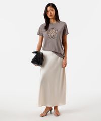 Camiseta feminina confeccionada em malha macia de algodão com estampa localizada de ilustração de ursinho com chifres e auréola na parte frontal e posterior. A peça tem a modelagem reta e o caimento é confortavelmente solto ao corpo. O modelo tem gola redonda em tecido com textura canelada e as mangas são curtas com acabamento pespontado nos punhos e na barra.