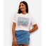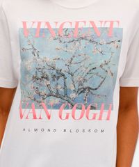 Camiseta feminina confeccionada em malha macia de algodão com estampa localizada da obra Amendoeira em Flor de Vincent Van Gogh na parte frontal. A peça tem a modelagem reta e o caimento é confortavelmente solto ao corpo. O modelo tem gola redonda em tecido com textura canelada e as mangas são curtas com acabamento simples nos punhos e na barra.