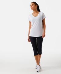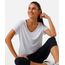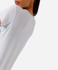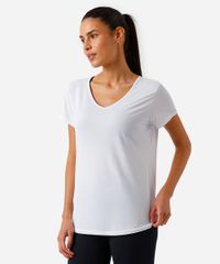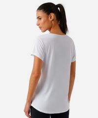 Camiseta feminina confeccionada em malha macia de poliamida. A peça tem a modelagem reta e o caimento é confortavelmente solto ao corpo. O modelo tem decote V e as mangas são curtas com acabamento pespontado nos punhos e na barra.