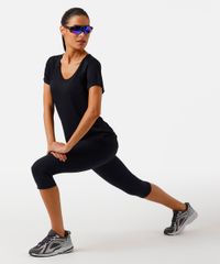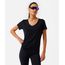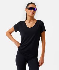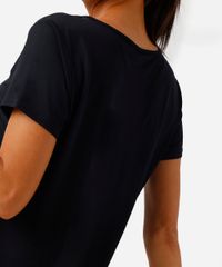 Camiseta feminina confeccionada em malha macia de poliamida. A peça tem a modelagem reta e o caimento é confortavelmente solto ao corpo. O modelo tem decote V e as mangas são curtas com acabamento pespontado nos punhos e na barra.