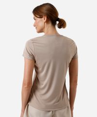 Camiseta feminina confeccionada em malha. A peça tem a modelagem reta e o caimento é confortavelmente solto ao corpo. O modelo tem gola redonda em tecido com textura canelada e as mangas são curtas com listras contrastantes nos ombros e acabamento pespontado nos punhos e na barra.