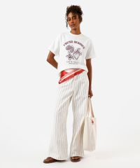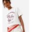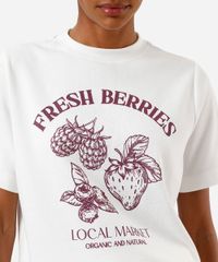 Camiseta feminina confeccionada em malha macia com algodão e estampa localizada escrito "Fresh berries" e ilustração de frutas na parte frontal. A peça tem a modelagem reta e o caimento é confortavelmente solto ao corpo. O modelo tem gola redonda em tecido com textura canelada e as mangas são curtas com acabamento pespontado nos punhos e na barra.