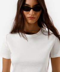 Camiseta feminina confeccionada em malha macia de algodão. A peça tem a modelagem reta e o caimento é confortavelmente solto ao corpo. O modelo tem gola redonda em tecido com textura canelada e as mangas são curtas com acabamento pespontado nos punhos e na barra. Composição: 95% algodão 5% elastano Modelo veste: P/38 Medidas da modelo: Altura: 1,73m Busto: 79cm Cintura: 60 cm Quadril: 90cm Instruções de lavagem: - Temperatura até 40º - Não alvejar - Não secar em secadora - Secar na vertical - Passar em temperatura média - Não lavar à seco - limpar à úmido