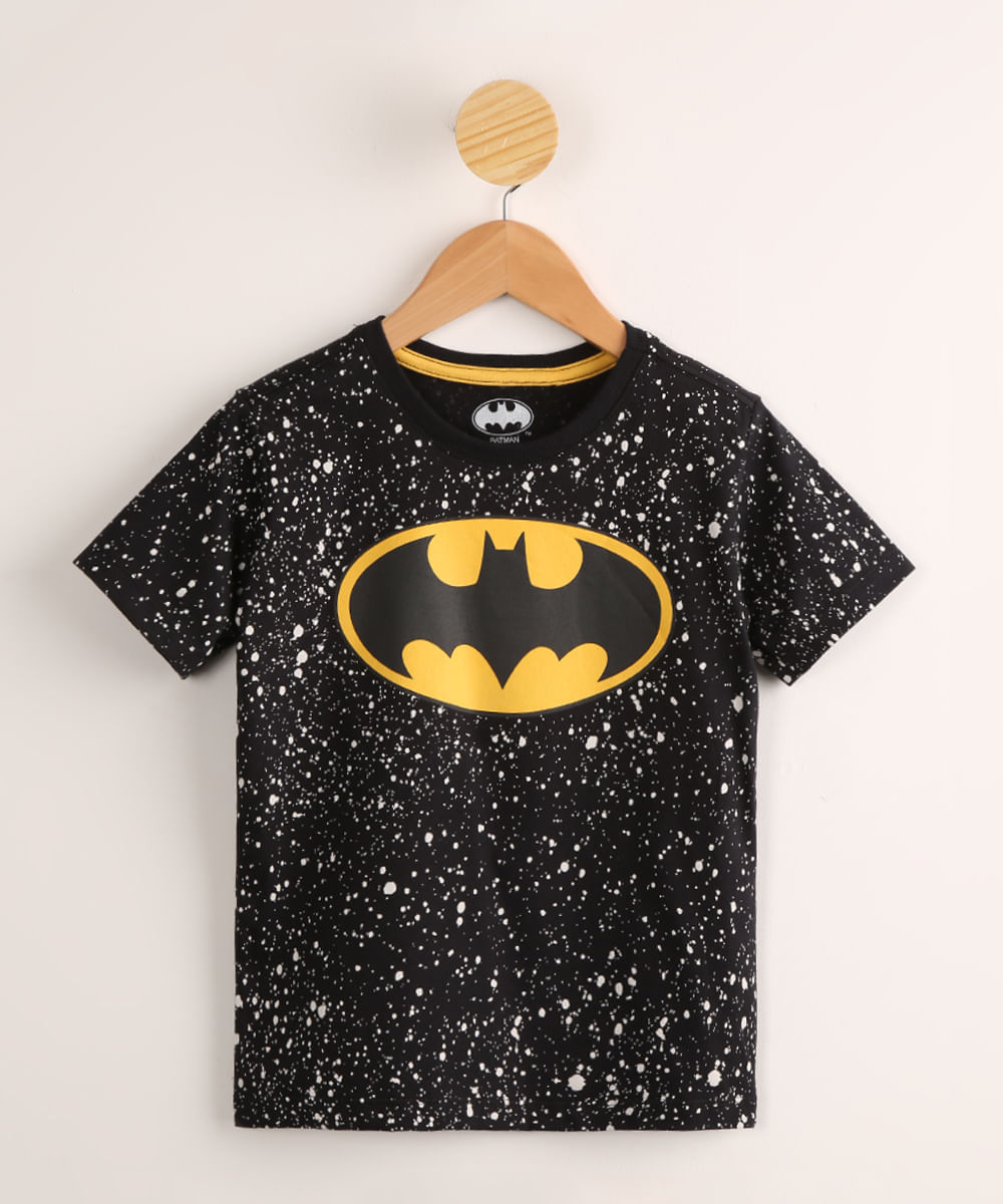 Camiseta infantil masculina confeccionada em malha de algodão. A peça é toda estampada com respingos, e na parte frontal tem estampa localizada do Batman. O modelo possui modelagem reta, soltinha no corpo. Com gola careca em ribana e mangas curtas.
