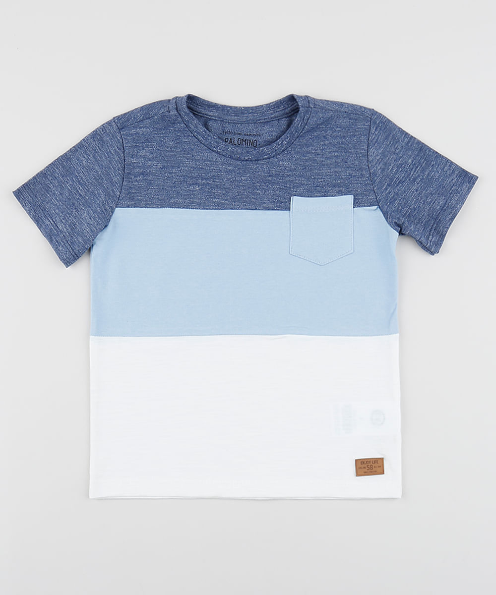 Camiseta infantil desenvolvida em malha. Tem recortes nas cores azul escuro, azul claro e branca. A peça também tem aplicação de bolsinho na parte frontal. A gola é careca em cor contrastante e as mangas são curtas.