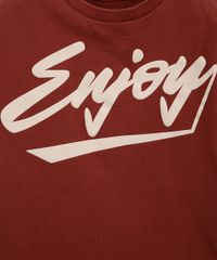Camiseta infantil confeccionada em malha macia de algodão com estampa fontal localizada escrita "Enjoy" na parte frontal. A peça tem a modelagem reta e o caimento é confortavelmente solto ao corpo. O modelo tem gola redonda em tecido com textura canelada e as mangas são curtas com acabamento pespontado nos punhos e na barra.