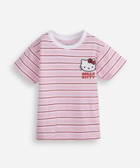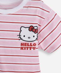 Camiseta infantil confeccionada em algodão com toque macio. Possui modelagem reta, caimento levemente solto, gola redonda, mangas curtas, padronagem listrada, estampa frontal da personagem Hello Kitty.