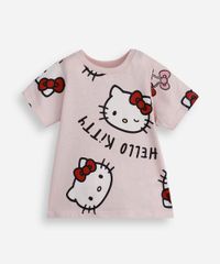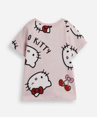 Camiseta infantil confeccionada em algodão com toque macio. A peça possui modelagem reta com caimento levemente solto, decote redondo canelado, mangas curtas, estampa frontal com desenho da personagem Hello Kitty em cores contrastantes e acabamento pespontado.