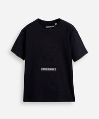 Camiseta infantil confeccionada em algodão. Possui modelagem reta, gola redonda com toque canelado, mangas curtas, detalhe frontal do personagem de Minecraft em alto relevo e acabamento pespontado.