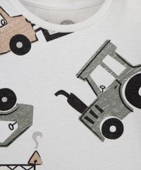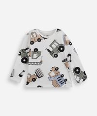 Camiseta infantil confeccionada em malha macia de algodão com estampa de tratores. A peça tem a modelagem reta e o caimento é confortavelmente solto ao corpo. O modelo tem gola redonda e as mangas são longas com acabamento pespontado nos punhos e na barra.