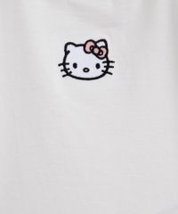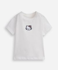 Camiseta infantil confeccionada em algodão. Possui modelagem reta, gola redonda, mangas curtas, detalhe frontal com estampa bordada da personagem Hello Kitty e acabamento pespontado.
