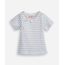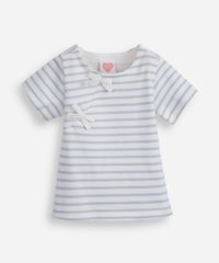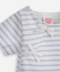 Camiseta infantil confeccionada em malha canelada com padronagem listrada. A peça tem a modelagem reta e o caimento é confortavelmente solto ao corpo. O modelo tem gola redonda, detalhe com laço aplicado, mangas curtas com acabamento pespontado nos punhos e na barra.